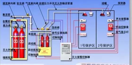消防气体灭火系统一般由灭火剂储存瓶组、液流单向阀、气流单向阀、压力开关、选择阀、阀驱动装置、喷头、集流管、释放管网及报警灭火控制器等组成。